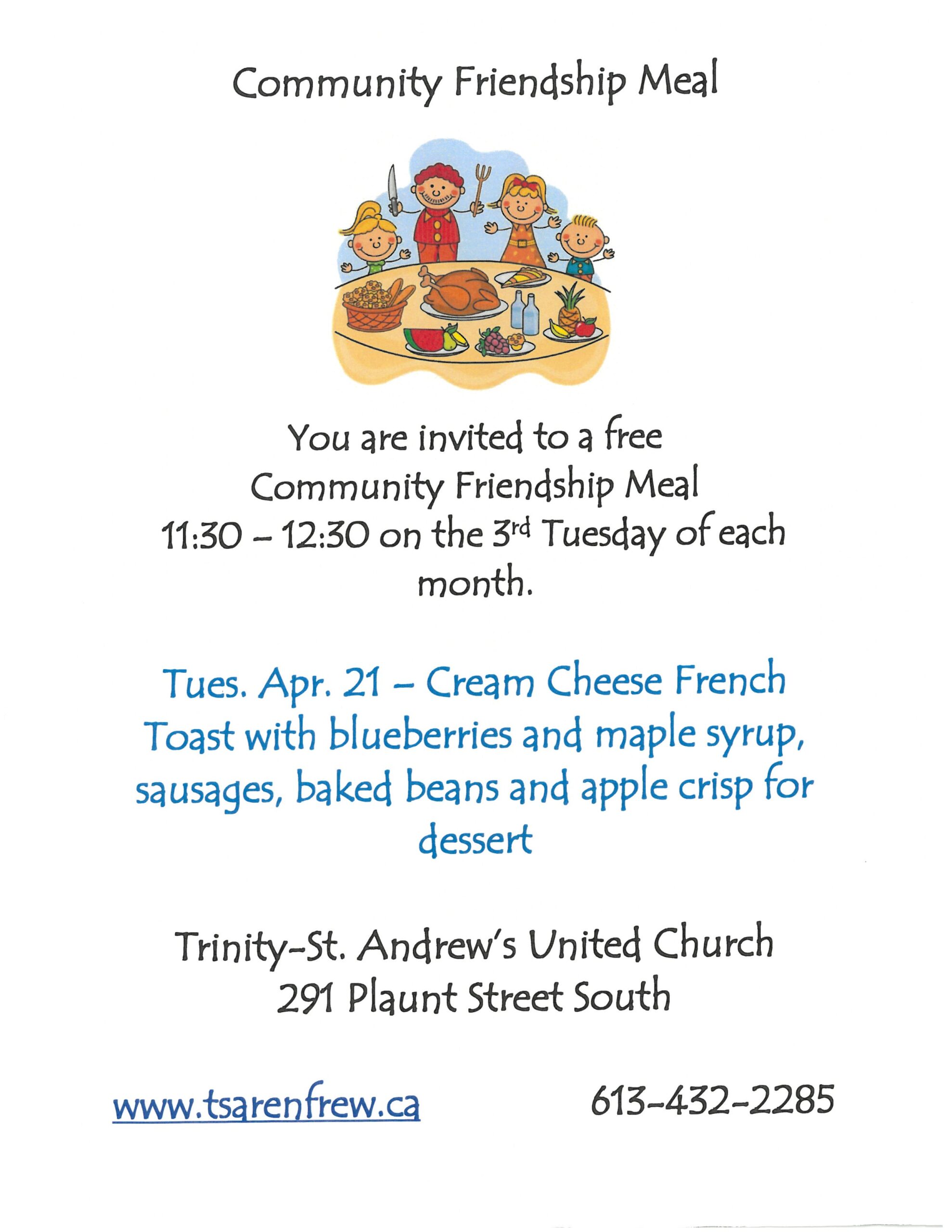 TSA’s next monthly free community lunch is on Tues. Apr. 21, from 11:30-12:30. Menu is cream cheese French toast with blueberries and maple syrup, sausages, baked beans & apple crisp for dessert. Please enter via the Quarry Avenue entrance. “Donations accepted but not expected”.