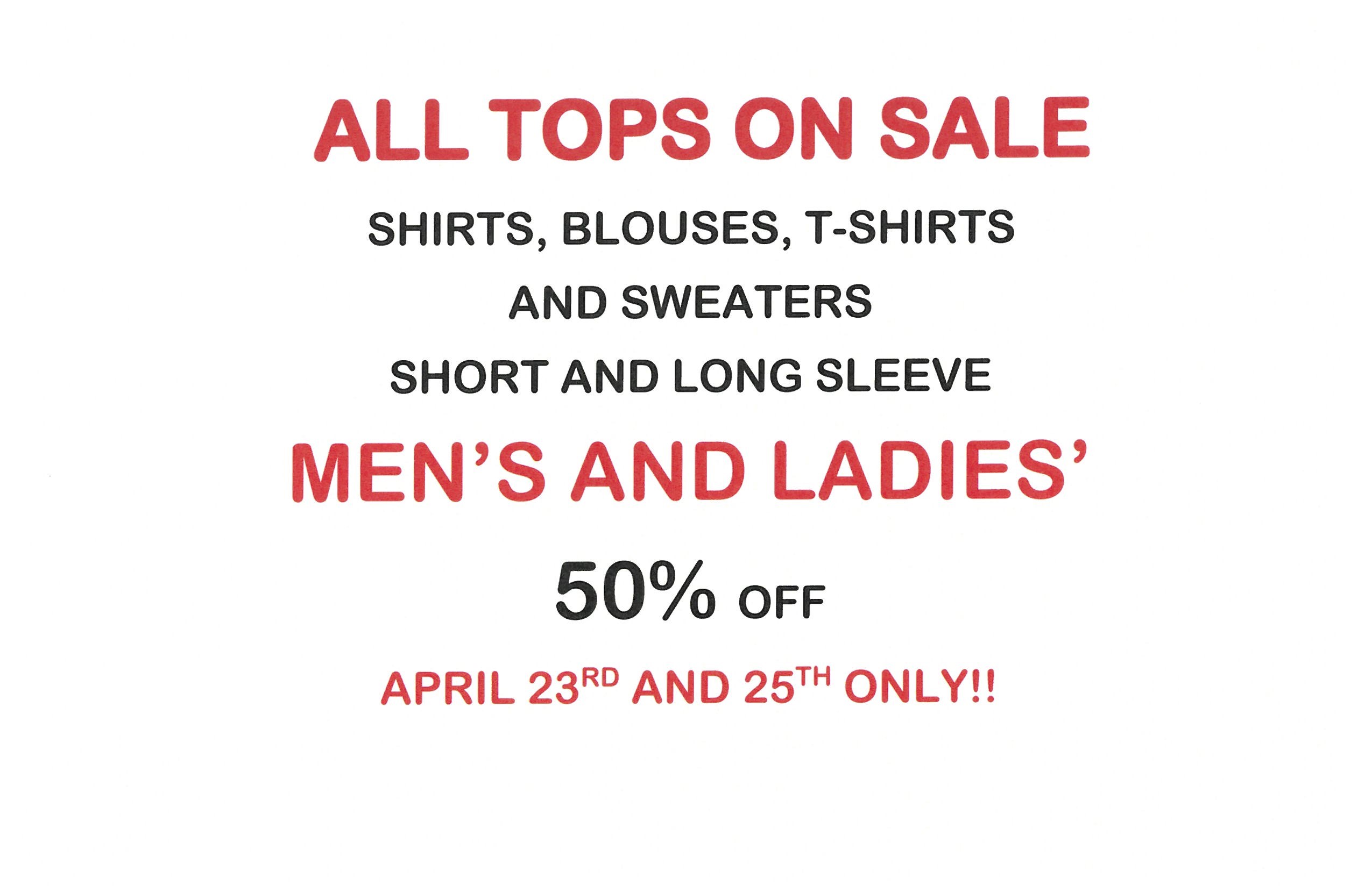 This week’s sale at the TSA Thrift Shop is all men’s and ladies’ shirts, blouses, t-shirts, and long and short sleeve sweaters are 50% off! Sale runs Thursday April 23 (11-5) and Saturday April 25 (10-2). Please bring your own bags, and please enter via the Quarry Avenue entrance.